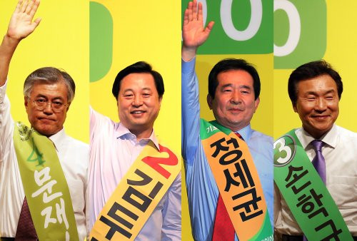 在擊敗了(前近畿道知事)民主黨黨代表孫鶴圭、現任慶尚南道知事金斗官(韓國建國以來首位非保守政黨的慶尚道知事),以及五選國會議員的丁世均等三位「超重量級」對手之後,人權律師文在寅成為韓國最大進步派政黨,「民主統合黨」的總統候選人。