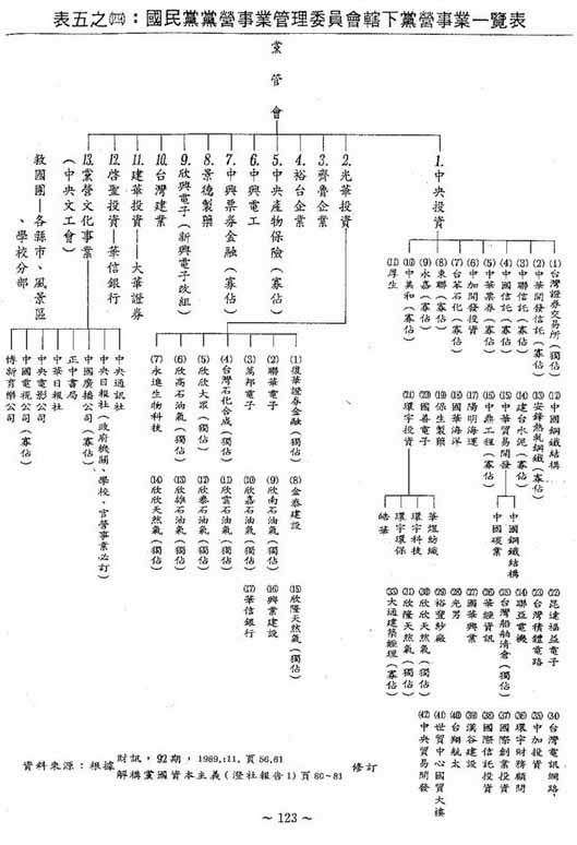 最近在新北市肇禍造成傷亡的欣欣天然氣公司其實也曾是國民黨營事業,現在則是由效忠國民黨的軍系與國民黨員主導。軍系的退輔會投資了16間天然氣公司,其中6家董事長、5家總經理都是為軍系高階將領,任職天然氣公司副總經理以上職務的退休將領有人年薪將近500萬。除了軍系外,國民黨要員更主導天然氣公司,例如現在肇禍的欣欣董事長陳何家曾任國民黨中央委員,其他國民黨員經營的天然氣公司也頗多,例如大台南區天然氣董事長高育仁(朱立倫岳父),欣中天然氣董事長林高德、欣彰與欣雄天然氣董事長朱坤塗、欣高石油氣董事長陳田錨、欣高石油氣總經理陳建東(陳田錨之子)等等都是國民黨人。對了,不知道現在天然氣(瓦斯)價格老是出現「國際漲台灣就漲」、「國際跌台灣還是漲」的怪現象,是否與這有關?