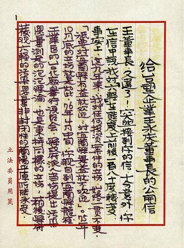 因為台塑不死心,陳定南在 1990年12月5日親筆致函王永慶,他在信中批評,台塑利用「中國牌」(即海滄計畫)對政府予與予求。陳定南也批評王永慶自誇的德州廠污染防制,陳定南 指出,台塑德州廠獲得美國三冠王,亦即(一)德州有史以來最高的水污染罰款、(二)美國聯邦有史以來最高的空氣污染罰款、(三)德州環保團體封為「世界級 的環境惡徒」。陳定南在信中強調,在宜蘭像他這樣反六輕的很多;他說,六輕不是「你我」之爭,而是台塑向法律與政府威信的挑戰。