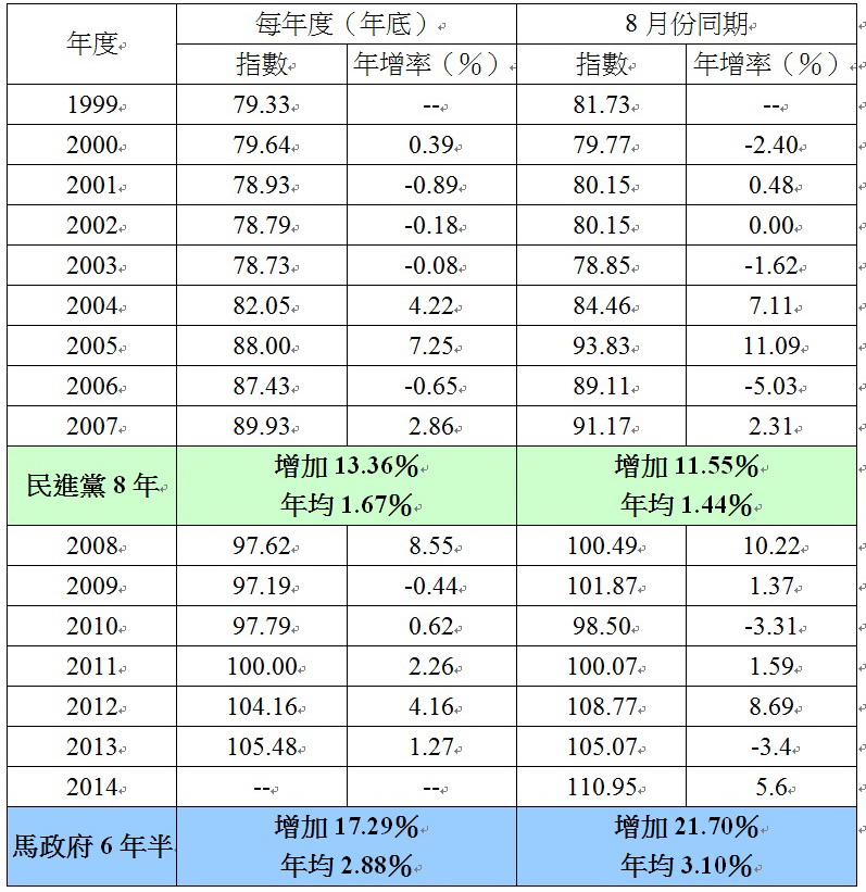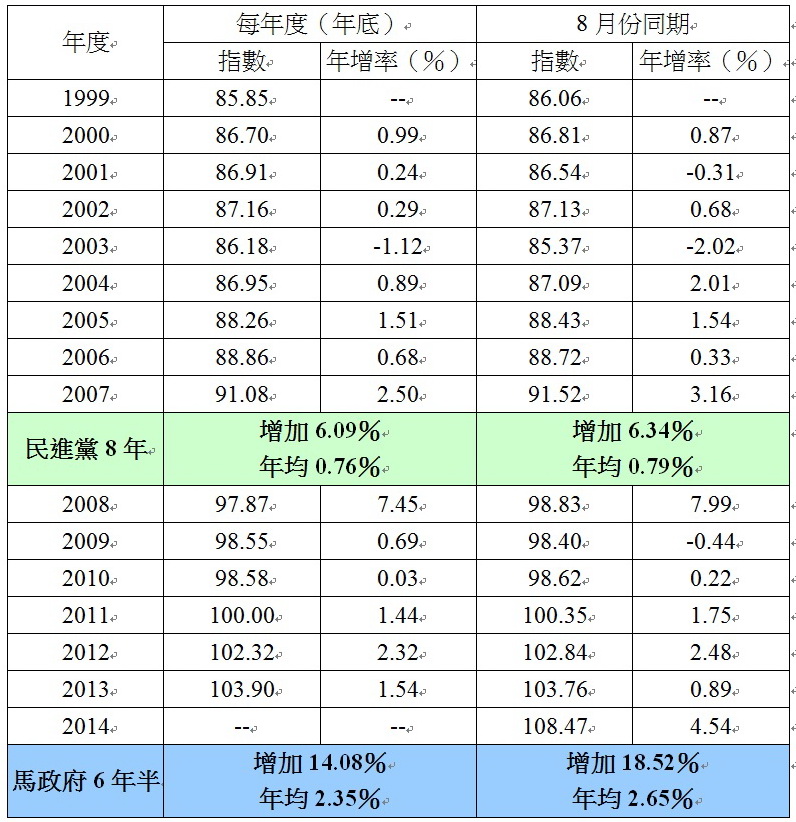 依主計總處的物價調查(表一),國人的食物花費支出日益高漲,食物類物價指數在民進黨執政時期增加13%,平均每年增加1.6%。國民黨馬英九上台後,食物費指數至今增加超過17%,平均每年增加2.88%;以最新公布的8月份調查結果為例,相較2008年同期甚至增加將近21.7%,馬英九時期平均每年增加高達3.1%。也就是說,假如2007年時一餐90元可以解決,現在就要花110元。