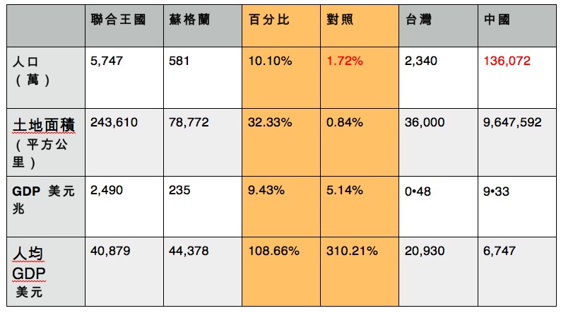 一旦蘇格蘭獨立,聯合王國將失去32.33%土地;10.10%的人口;9.43%的GDP。這衝擊實在夠鉅大,但英國尊重公投結果;相對的,中國承認台灣獨立,則只是少增加0.84%土地;1.72%人口;5.14%GDP,可以說微不足道,但中國堅持反對台獨。