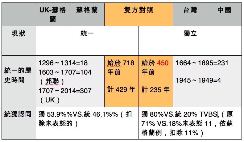中國統一台灣是康熙皇帝開始的,從1664到現在是450年;但是英格蘭第一次佔領蘇格蘭是1296年,到現在已經718年,時間多了一大截。