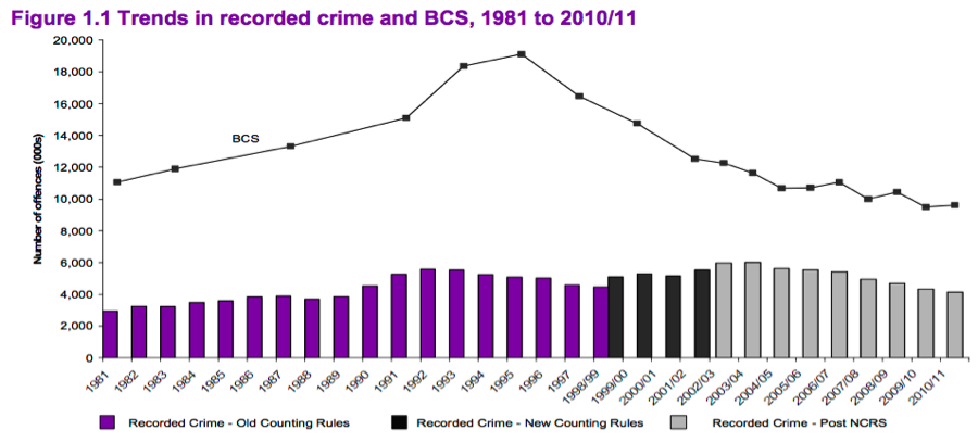 美國與英國,1990年代以後的犯罪率(或被害率)皆下降(來源:美國司法部與BCS)