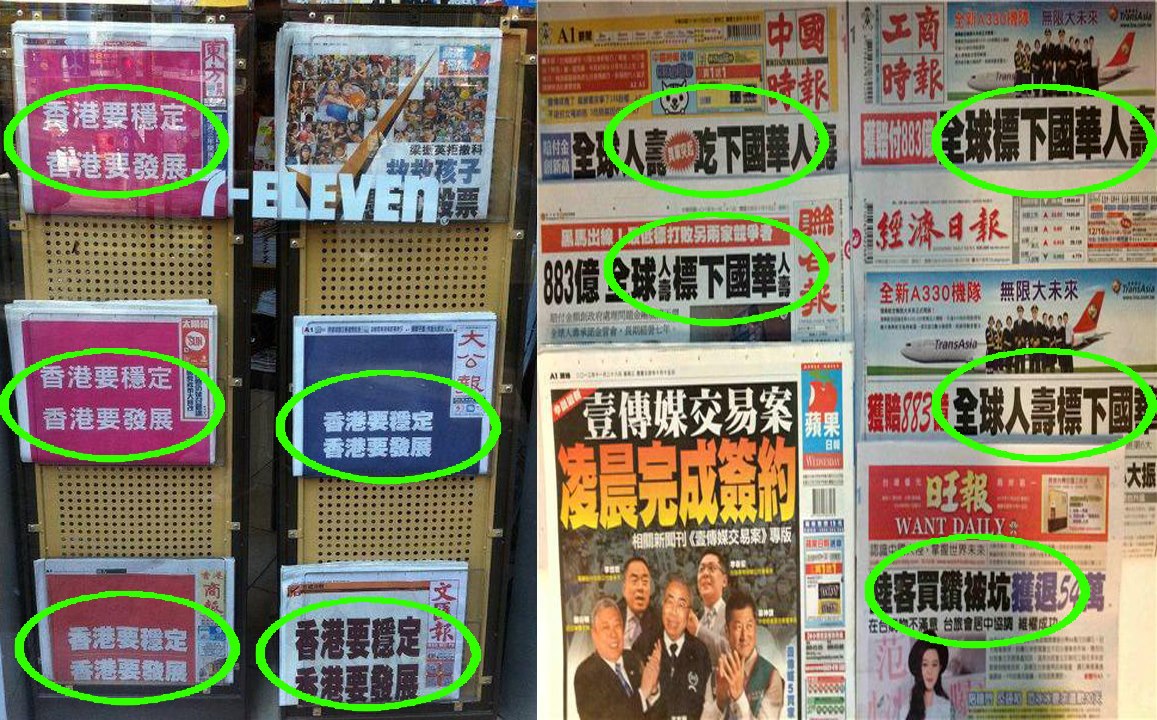 九月初,網路上流傳了一張照片,是香港立法議會選舉當日所有報紙頭條的總匯,除了香港蘋果日報以外,皆刊登「香港要穩定,香港要發展」全版廣告,其意味自不待言。當然,台灣也有所有報紙,包括台灣蘋果日報,都刊登房地產公司廣告的紀錄,本來也只是五十步笑百步。然而,壹傳媒併購交易案與隨之而來政院級的連日抗爭,激起的漣漪之小仍令人咋舌。台灣距離香港到底多遠多近?網友製作對照圖說,兩相比較「雖不中亦不遠矣」;中研院士、歷史學家余英時說得更白:「香港同時也是一個鮮明的例子,警告所有在台灣的中國人:中華民國的獨立主權是必須盡一切力量予以維護的!」