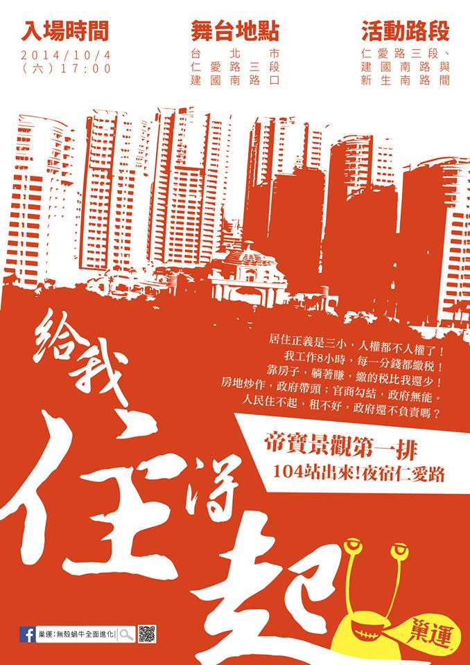 近七十個關注住宅問題的社運及社福組織共同發起「巢運」,日前在25年前無殼蝸牛運動同一地點召開記者會,針對高房價和居住議題,提出5大訴求。內政部立即回應,為落實居住正義,將持續推動多元住宅政策,讓住者適其屋,未來10年內社會住宅將達到3萬4千戶、租金補貼將達到6萬5千戶…。針對這種沒有未來、沒有想像、無關痛癢、一騙再騙的回應,你還願意忍耐下去嗎?