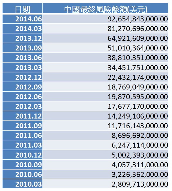 中國向台灣的銀行貸款一旦出狀況,絕對足以讓台灣的金融發生危機。民進黨執政八年期間,為了打銷國民黨執政所留下來的銀行呆帳,總計8年花了約1兆9900億元處理;如今,在本國銀行跨國國際債權餘額問題上(見下表),中國的最終風險餘額從2010年3月底的約28億美元(約840億台幣)急速攀升到2014年6月底的926.5億美元(約2兆7795億台幣)。試想,如果將近3兆台幣都發生狀況,台灣如何承受?更何況,這些中國的風險餘額正不斷加速成長中,短短4年就成長了33倍。