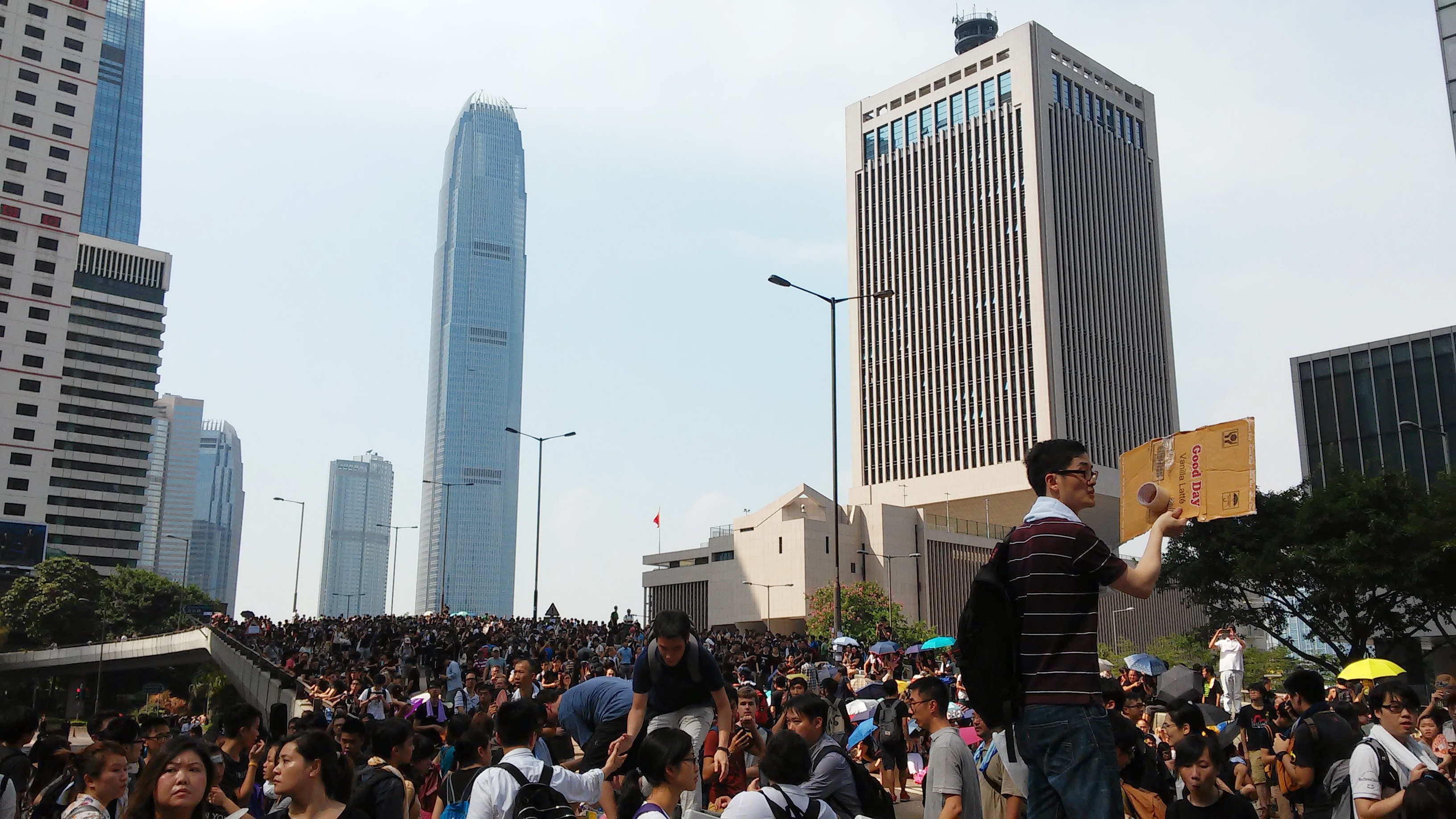 9月26日晚,一批學生成功「重奪公民廣場」之後,警察迅疾把他們團團圍住。而要求釋放學生的人群又里三圈外三圈地將警察圍住,數千人在政總外通宵守夜,並把這不規則的區域喚作「自由廣場」。