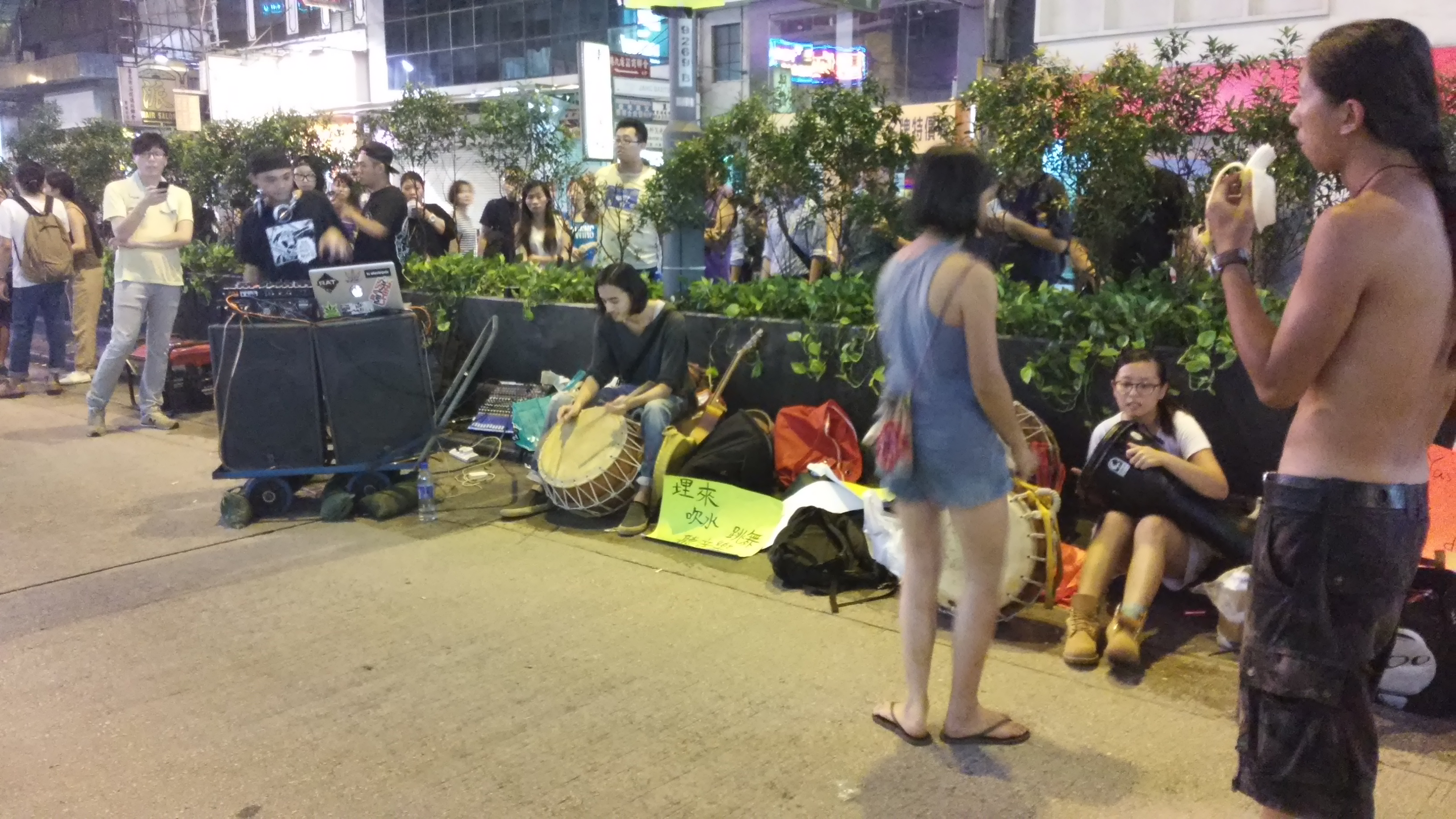 樂隊不會缺席,跑着調自娛自樂,懶理你是否能跟上合唱,在旺角,又有誰會care呢?極限運動(單車、滑板)旋即加入,哪還會有比這更完美的練習場地?小販也很快出現,賣現榨果汁和港式小吃。運動逐漸變成持久戰之後,被子枕頭俱全的木板牀被擺上了街頭,隔天,碌架牀(雙層上下鋪)又蓋過了前者的風頭。被攔截的巴士貼滿了便利貼、路中間隔開雙向車道的石塋寫滿粉筆字,極具創意的民主牆絲毫不比金鐘的Lennon Wall遜色。