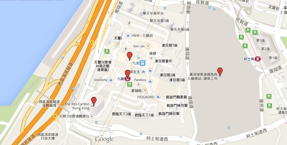 西九龍區域地圖,一個被金融資本啃蝕出來的不屬於香港在地的空間。標識左至右:環球貿易廣場ICC,九龍站(通機場),圓方Elements商場,高鐵工地(通北京)。