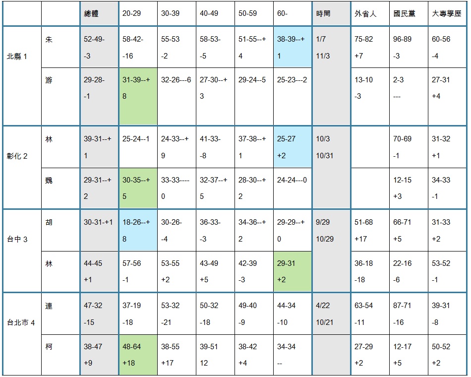 三、20~29歲年輕人一面倒向綠營。彰化、台北市、台中市三地都一樣。其中,台中市高低差了一倍還多;台北市更持續擴大成3倍多;而總體上國民黨大贏的新北市,國民黨都從大贏被拉平。台中市綠營候選人的年輕人支持度雖然有滑落現象,但也只是在既有的大趨勢之中的小幅回檔而已,並不是趨勢的逆轉,因為綠營候選人年輕人支持度仍然比對手一倍還多。