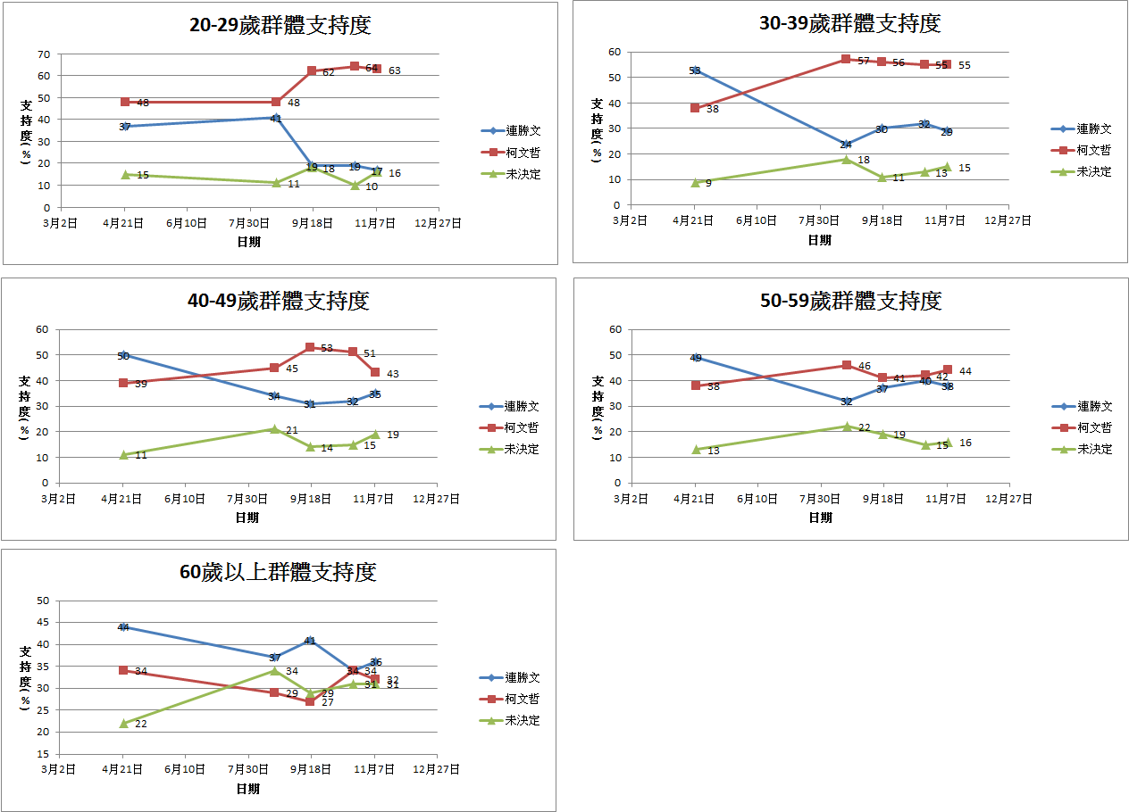 參考TVBS各於九月中及十月中對台北市民進行的電話民調,兩位參選人的支持板塊有兩項重要的顯著區別:教育程度與年齡。從教育程度方面來看,連勝文在大專以上學歷的選民群體中自八月中以來就大幅落後,達21%之多;而在國中以下群體中從九月中領先多達9%,也在十月中落後了1%。從年齡的角度來看,連勝文僅在60歲以上及50-59歲兩群體中勉強與柯文哲維持平盤,選民族群越年輕,連勝文的落後幅度就越顯著,甚至在20-29歲這一群體中,落後達45% (19%: 64%)。