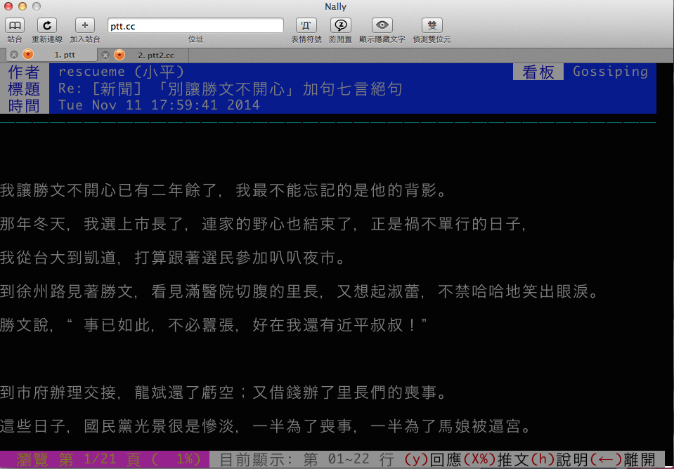 近來盛傳一句名言「別讓勝文不開心」,不論是否出於連方瑀女士的口中,這句話已然定型為某種流行符碼,植立於近期社會裡。有趣的是,網路bbs看板出現大量以此七字作為藏頭的創作,體裁橫亙古今韻散,內容專門影射時事,呈現時下特有的創作模式,並獲得大量迴響。這啟發我反思,為何大眾一面舉著反古的旗幟,一面又熱衷讚揚改編的古文詩詞呢?除了新奇、好玩之外,應有其餘古文特有的吸引力,否則無法引起如此風潮。