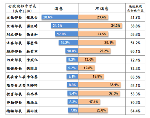 這張表很殘酷,說明了民意有多麽地不喜歡他們,沒有一個人滿意度達到三成,達到兩成只有兩個,其他都是個位數字。更慘的是,民眾對他們的施政都陌生無感到難以想像的程度。幾乎所有的人都讓六、七成民眾對他們「完全沒印象」。