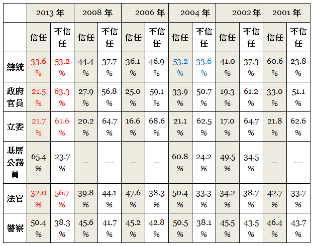中央政府機關的公職中,原本民眾最不信任的是立委。依據群我倫理促進會的歷次調查,不信任度總是遠遠超過信任度;信任度一直在20%上下起伏,最低時還曾到了16.6%的程度。但是在馬總統執政的第五年,中央政府官員的信任度終於低於立委,而不信任度高於立委,成為不被信任的冠軍!這還是去年的調查,今年如果再次調查,情況保證更慘,就像台灣民意指標公司的民調一樣。