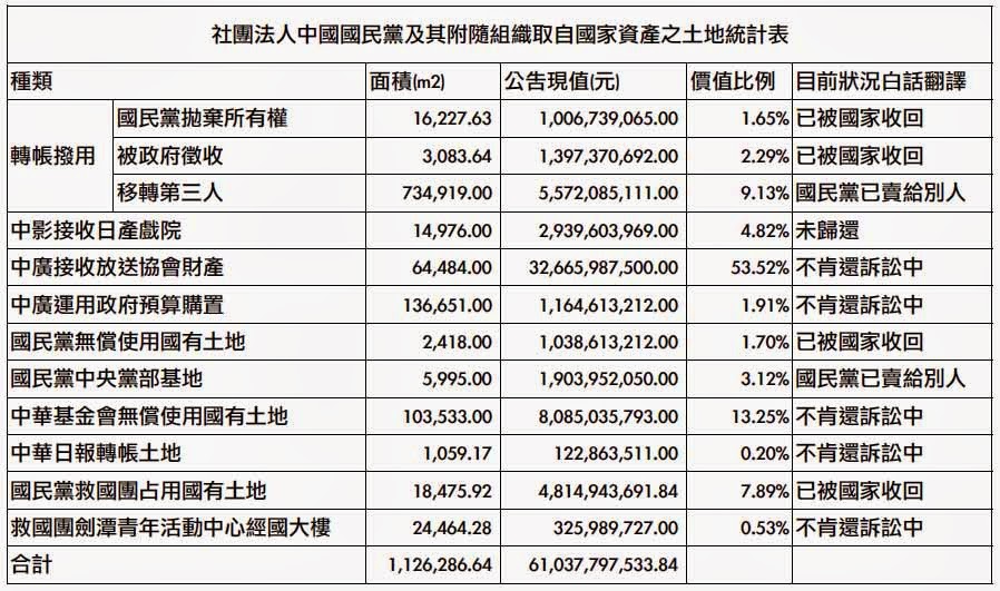 國民黨到底多有錢?根據內政部在2014年公佈的政黨及政治團體財務申報資料,國民黨在2013年的黨產有268億41萬303元;不過,這只是帳面數字,因為國民黨營事業是以股票面值計算。以2010年的黨營事業市值為例,《今周刊》社長梁永煌根據證交所資料估計黨營事業的股票價值就高達781億元。黨產的好用,選舉時就知道。內政部長陳威仁在12月10日於立法院質詢時明白表示:「黨產本來就是要用來選舉的啊!」甫落幕的九合一選舉讓我們見識到威力,選前國民黨的廣告大量轟炸,就可證明黨產有多好用。
