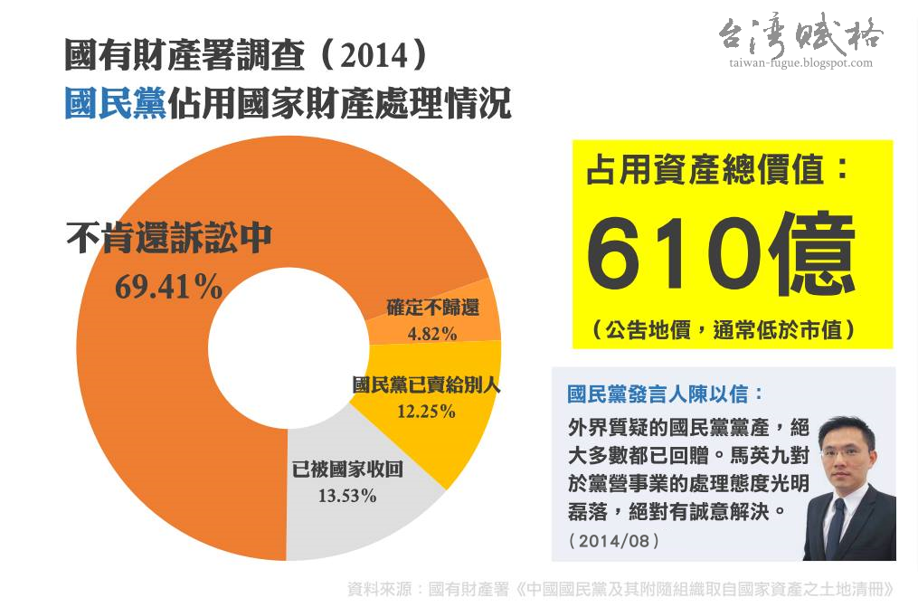 國民黨發言人陳以信不斷聲稱不當黨產已經「回贈」了98%,當然,國民黨在說謊。根據國有財產署資料,國民黨竊佔自國家的財產僅歸還13.53%;此外,國民黨已經將12.25%賣給他人,其他超過80%的國家財產就是不肯歸還。