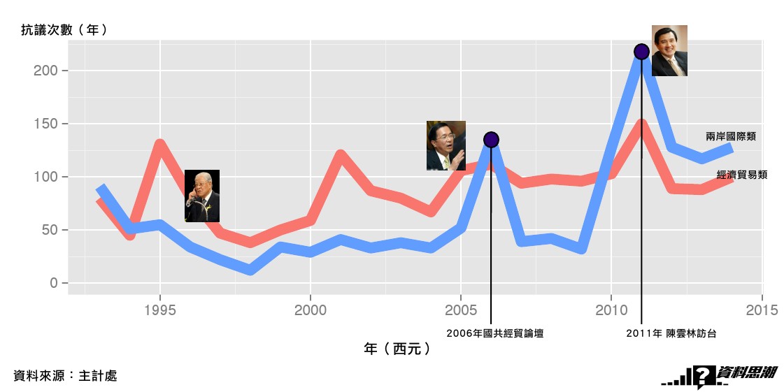 而經濟貿易類的社會運動訴求,往年從李登輝時代至陳水扁時代,每年的抗議件數約在100次左右,但可以發現在2011年有個高峰,即是與ECFA的簽訂有關。另一方面,為何經濟貿易類的社會抗爭一直無法有數量上的增加,這或許也跟議題理解容易程度有關,並非所有民眾能夠輕易地瞭解此類抗議訴求所想要表達的含義為何。
