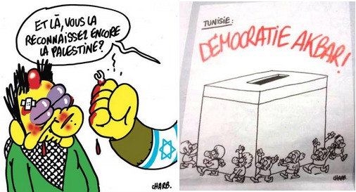 夏布曾描繪一個被以色列官方打得鼻青眼腫的巴勒斯坦人,前者嗆聲道:「怎樣?你現在還認得出巴勒斯坦嗎?」法文「認出來」(reconnaître)一字也有「承認」之意,以色列並不承認巴勒斯坦是個國家。Riss則畫了一個在沙灘上玩耍的小孩,沙地上露出幾顆未爆彈,小孩頭顱掉在玩具桶子上,標題寫著:「不乖就送你去加薩走廊度假。」當突尼西亞茉莉花革命後舉行大選,《查理》描繪突國人民繞著票箱行走,如同穆斯林們在聖地麥加的朝聖行動,標題將阿拉伯文「真主至大」改成「民主至大」。《查理》呈現伊斯蘭先知的漫畫被指為挑釁或侮辱,那麼他們為阿拉伯世界普羅大眾發聲的作品,又有誰注意到了呢?