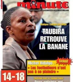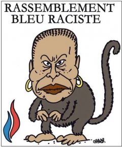 且慢,請仔細看看畫面上其他元素:圖像標題為「種族主義藍色政團」,但這明顯是由「海軍藍政團」(Rassemblement Bleu Marine)換一字變過來的,該政團由左下角出現黨徽的極右派政黨民族陣線(FN)所組建,夏布藉此諷刺該政黨、該團體全是一群種族主義者。而回頭看看法國極右派《Minute》雜誌某期封面,托必哈照片旁加註:「像猴子一樣聰明,托必哈找到香蕉」。
