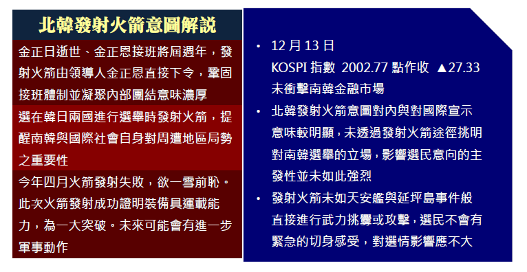 北韓於12月12日上午發射長程火箭(衛星),並順利進入預定軌道,引起國際間高度關注,台灣媒體也跟著大幅報導。許多人都好奇,這會不會對12月19日的南韓總統大選帶來衝擊。事實上,從北韓發射火箭的意圖來看,藉此動作鞏固內部士氣以及對外增加談判籌碼的意味,比起干預南韓總統大選來的更為濃厚。