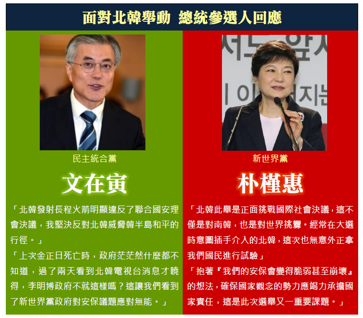 從上圖可以看見,朴、文兩位候選人都不約而同對北韓進行撻伐。但對看待國內因應北韓舉動,卻表現出截然不同的態度。