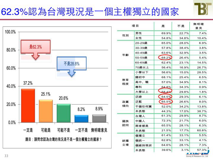 長久以來,台灣絕大多數的民眾都認為台灣已經是一個獨立國家了。最近新台灣國策智庫調查出來的數據是62.3%,不認同的只有28.8%。但是假使你認為主張台灣已是獨立國家的都是泛綠、獨派或自認為是台灣人的民眾,而否定的都是泛藍、統派或自認為中國人的民眾,那你就大錯特錯了。