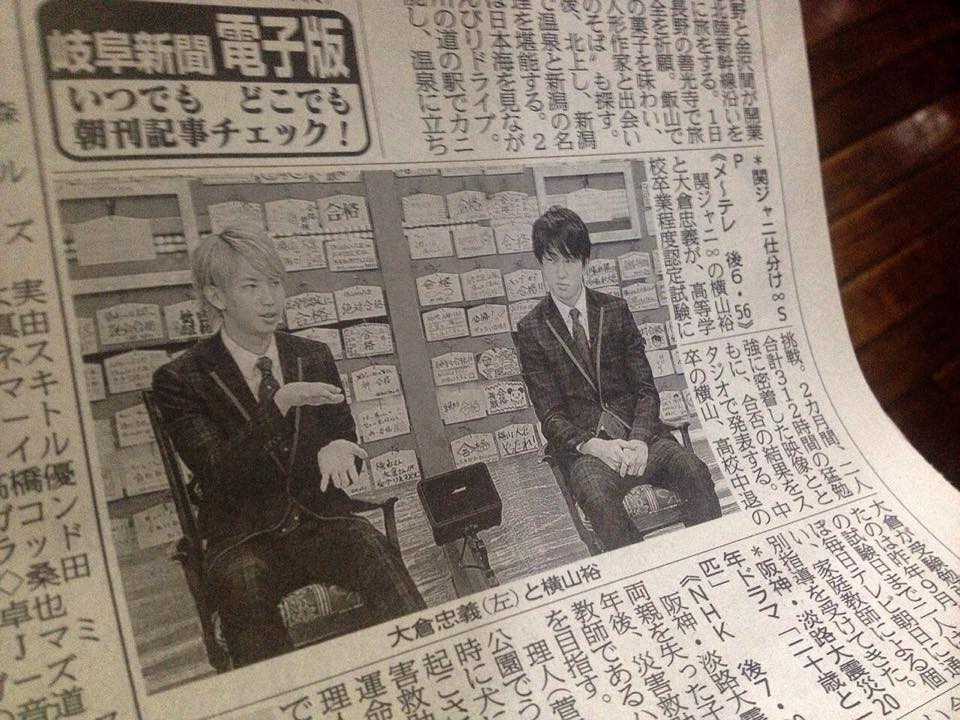 金黃色的彩帶於攝影棚內四射噴發,全場觀眾和其他關八的成員全都興奮地跳起來鼓掌,一向愛笑的大倉忠義更是嘴角裂到了耳際,而總是容易被感動掉淚的橫山裕在驚喜之餘,也只能一直用手來遮掩眼角的濕潤,這是1月17日,日本朝日電視台綜藝節目《関ジャニの仕分け∞》(台譯關八挑戰中)的一景,節目中發表,傑尼斯偶像團體關八成員大倉忠義和橫山裕,順利取得高中學歷認定證明。
