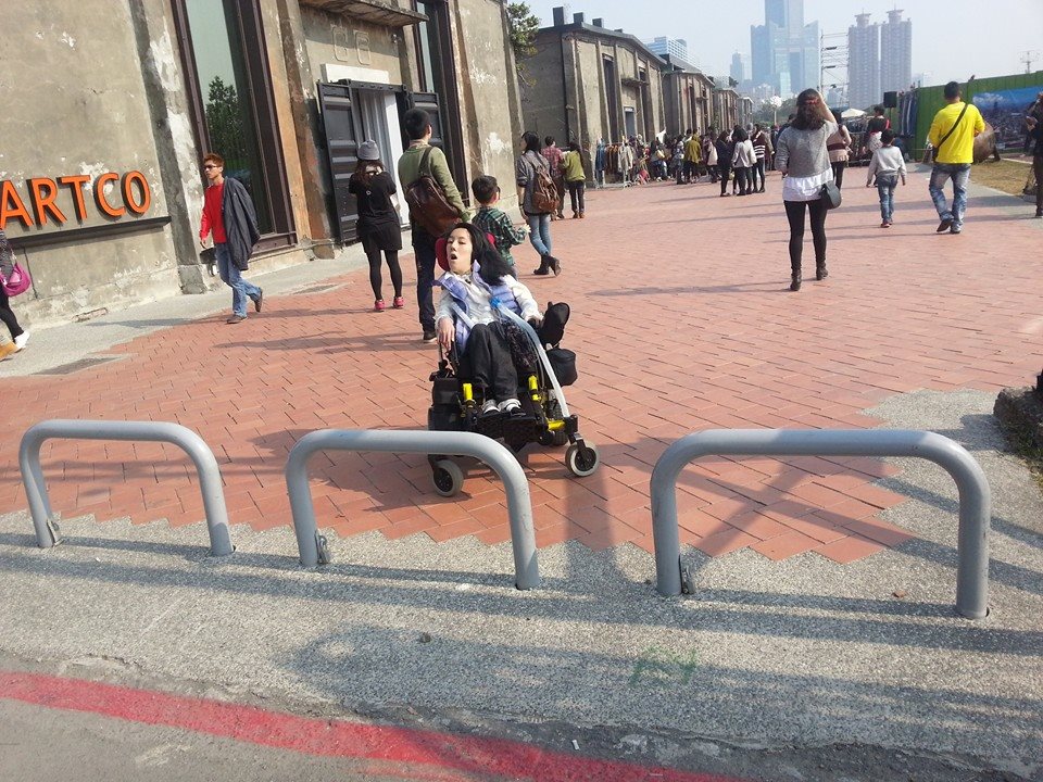 來到駁二,靠近碼頭一區的倉庫前,盡是ㄇ字形路阻,擋住輪椅的通行,諷刺的是,就在我和朋友討論如何改道而行時,一輛機車便穿越草皮,從路阻旁鑽了出來,當下,我們直接經驗「機車沒擋到,卻擋住輪椅使用者」的窘境。我想起跨年時,亦有障礙圈的夥伴,帶著使用電動輪椅的女兒來聽五月天跨年演唱會,全家人也順道在高雄旅遊,同樣在駁二碰到路阻的阻礙(見附圖),加上店家態度冷漠,讓他們留下「藝術人心中沒有人生而平等的價值,那麼他或她的作品再好,也不過是有錢人家的玩物了」這般既失望又憤怒的評語。身為在地人,我非常感嘆駁二藝術特區無法提供行動不便者和其他民眾一樣盡興的參觀經驗。高雄的藝文觀光有了豐富多樣的展演活動後,是否也該仔細審視我們的環境準備好迎接多元需求的賓客了嗎?從大眾運輸系統(包含公車、捷運、活動接駁車)到藝文場館硬體與展場設計的無障礙,都關乎一位身心障礙者拜訪高雄,是盡興或敗興而歸。