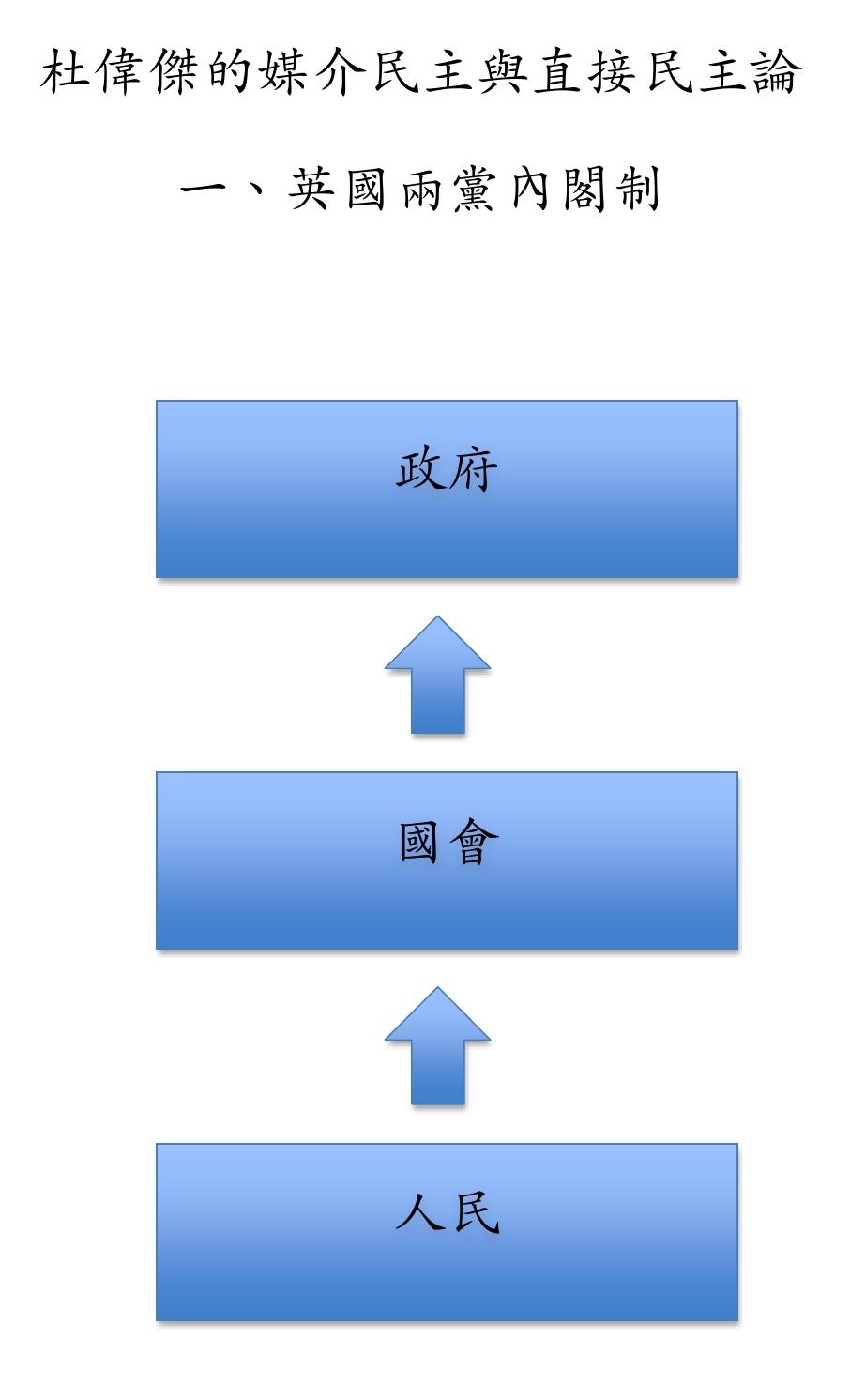 杜偉傑透過直接民主與媒介民主概念來分析各種體制的特色。首先論述英國狀況,英國是兩黨內閣體制,人民選出議員,可以馬上決定政府由哪個黨組成,人民知道自己選擇的議員所屬政黨在國會裡是多數還是少數。多數的人民支持的政黨政見或者政策,可以形成國家的主流意見與未來的方向。因此,雖然人民選的是國會議員,但人民的選票可以決定國家的大方向與政策。