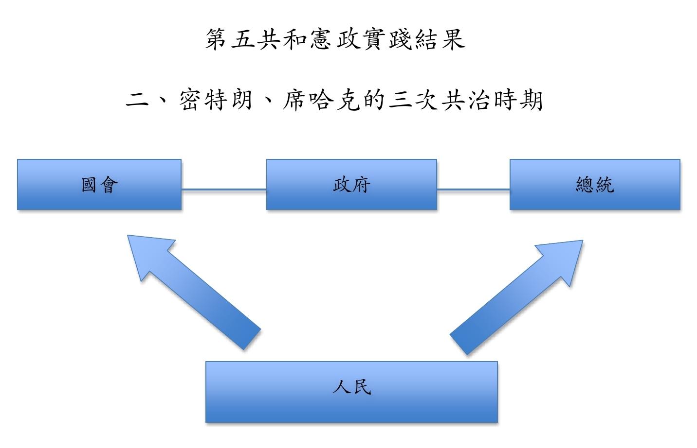 其次說明左右共治時期的權力模式結構。左右共治可說是一種例外的變形。一方面總統由人民選出,又有閣揆任免權,另一方面閣揆率領的政府又需要向國會負責。法國在90年代席哈克的憲政改革將總統任期縮短之前,總統任期一向是七年,國會五年,因此在總統的任期之內,一定會碰到國會改選。新的總統選上之後,萬一面對舊的反對黨佔多數的國會,總統可以解散國會形塑他的新國會以利政務推動。可是萬一總統在任期之中輸掉國會多數,那該怎麼辦?