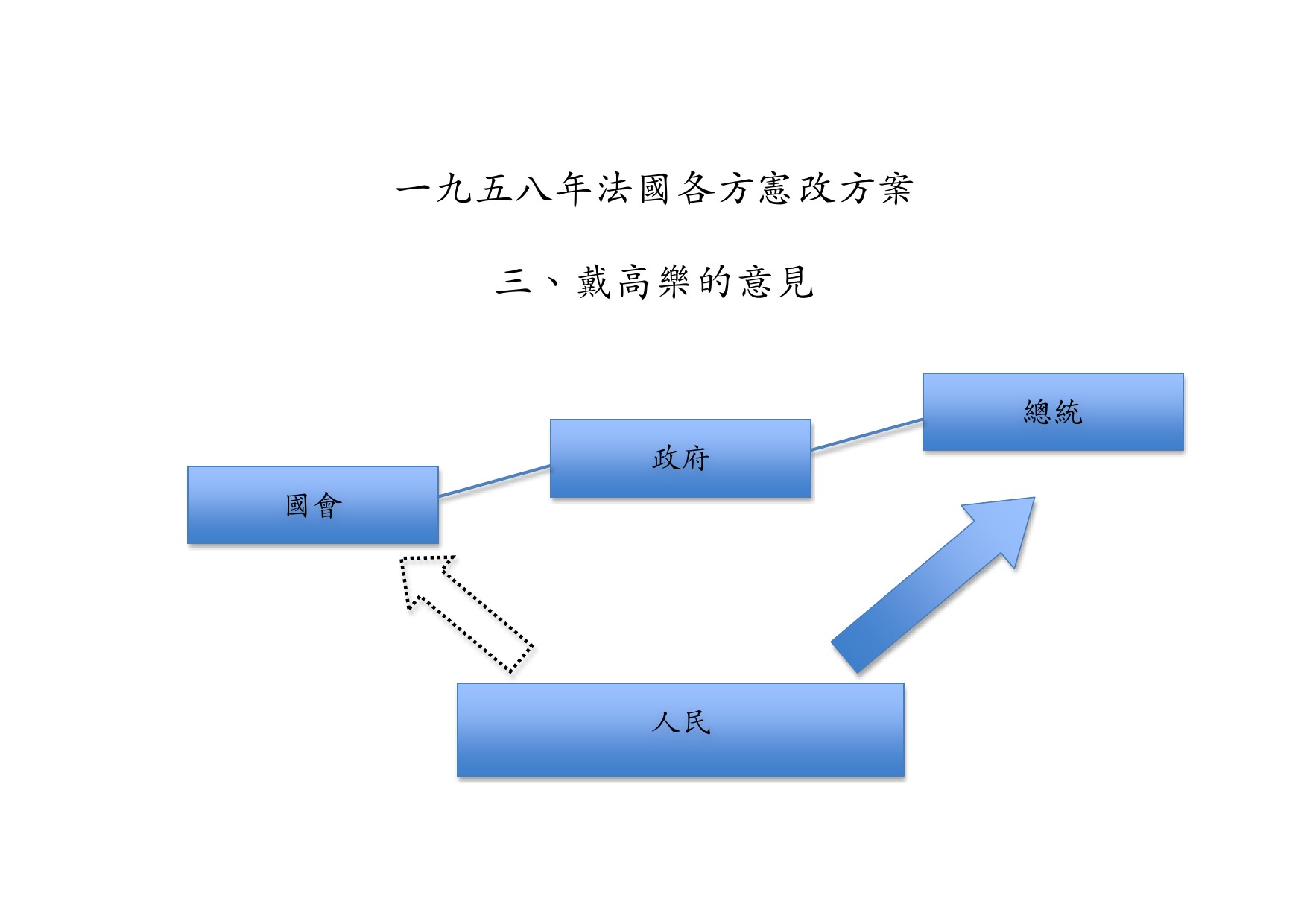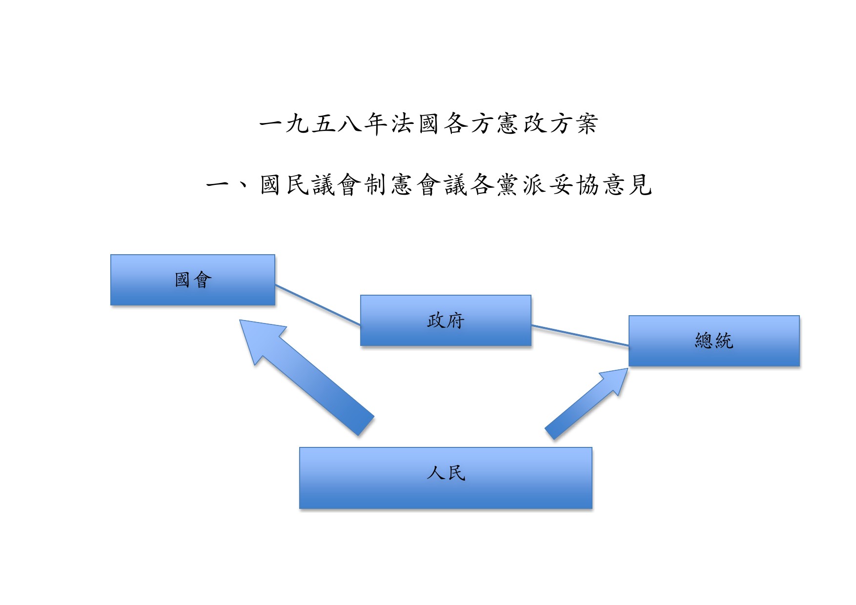 在了解第三、第四共和憲政困境的學界代表意見後,接著分析1958年法國憲改方案的政界意見。法國第三、第四共和到了1958年,遇到阿爾及利亞危機,於是面臨修憲的問題。首先說明的是有修憲權力的國民議會各黨派議員的折衷想法:一票投國會、一票投總統(58年當時還是間接選舉,由鄉鎮市長與民意代表加上國會議員組成選舉人團)。總統可以提名總理,國會要有閣揆同意權,權力配備上還是國會優先。這是國民議會各黨派對於第五共和憲法的妥協意見,參見下圖。