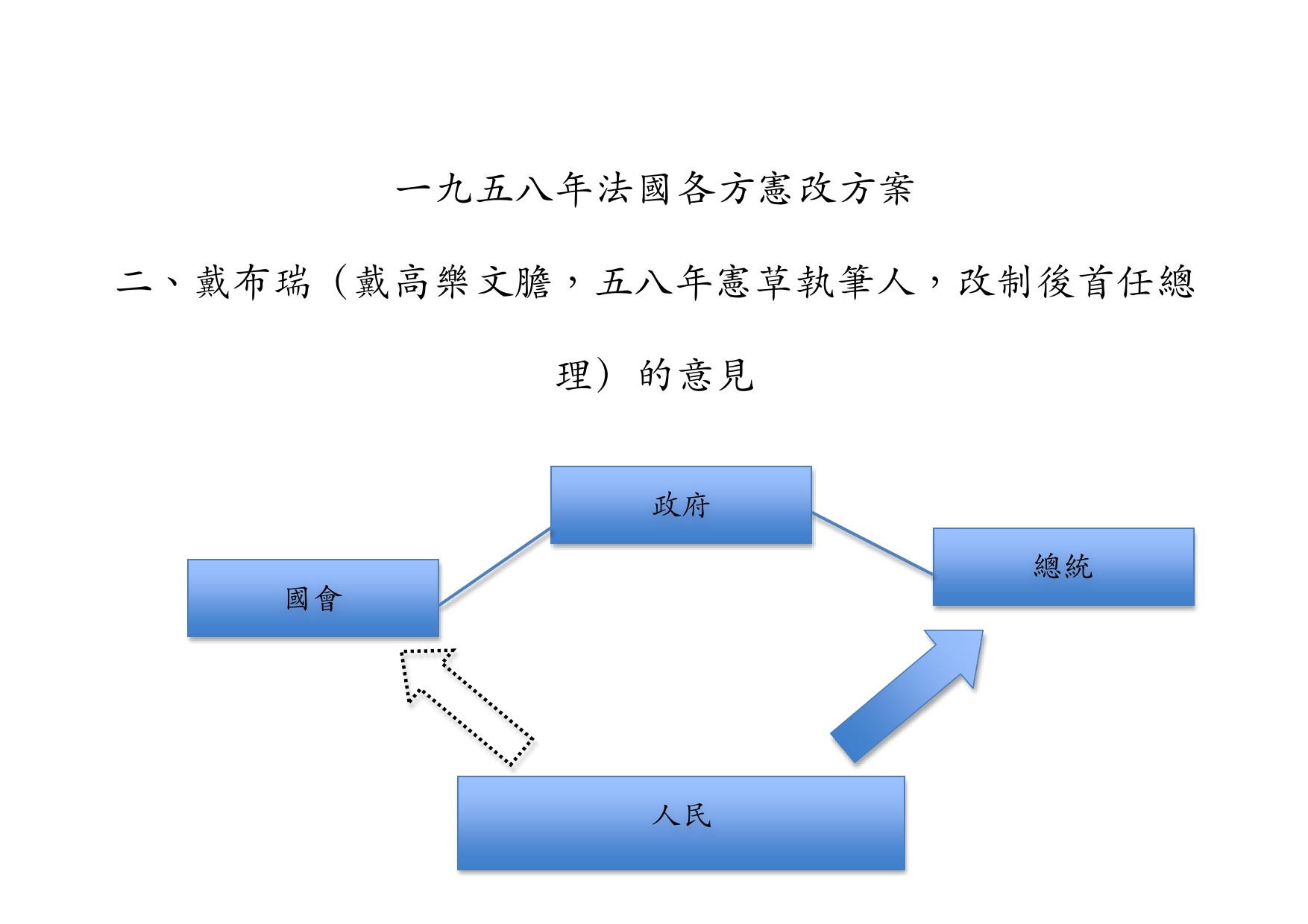 接著介紹戴布瑞(Michel Debré,戴高樂文膽,改制後首任總理,58年第五共和憲草主要執筆人之一)的想法。戴布瑞的想法裡依然維持議會內閣制的雛形,但把國會干預行政權組成的機制降低。政府與總理由總統任命,但是政府執行日常政務的權力比總統權力高。