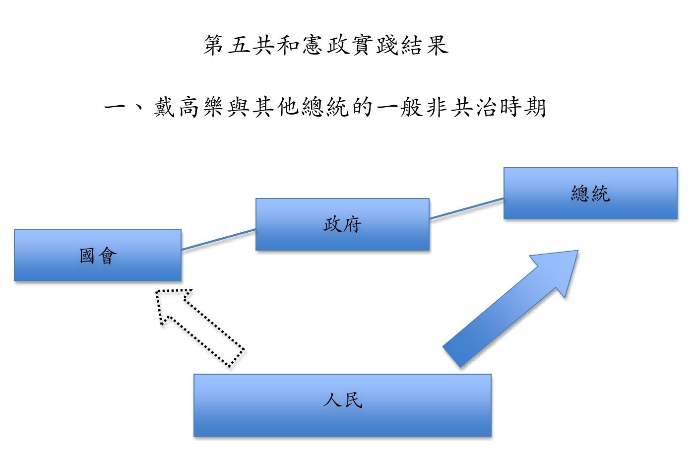 首先介紹戴高樂、龐畢度、季斯卡以及密特朗、席哈克兩位總統的非共治時期的權力模式架構。這也是2008年法國第五共和最大的憲政改革之前,平常時期的運作模式。如同戴高樂對於第五共和的想法一樣,總統承接民意之授權,位於整個憲政體制最高之地位。然後有一個由總統任命的總理率領的政府,負責實現總統訂下的國家大政方針,政府要對總統與國會負責。處於最弱勢地位的是國會,因為第三、第四共和國會權力太大,長期行政效能不彰,所以在改革之後,國會的權限被限縮得很厲害。