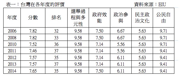在這項調查中,台灣在「選舉過程與多元性」跟「公民自由」都可以拿到超過9的高分(雖然公民自由的分數,在近期幾次調查都較06-10年間低了一些);「政府效能」居次,而從表一很明顯地可以看出,「政治參與」跟「民主政治文化」兩項,是台灣未能擠身「完全民主國家」的原因。