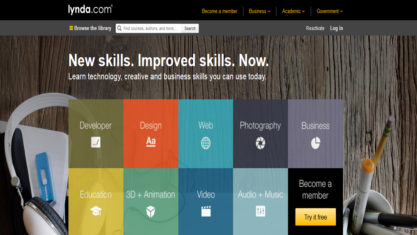 Lynda.com -- 一個線上影片為主的教學平台,由許多領域的資深人士實際錄製教學影片,可免費收看及上課。課程以廣意的「數位技能」為主,包括:攝影、影片、動畫、音訊、設計、網站、程式開發等等。