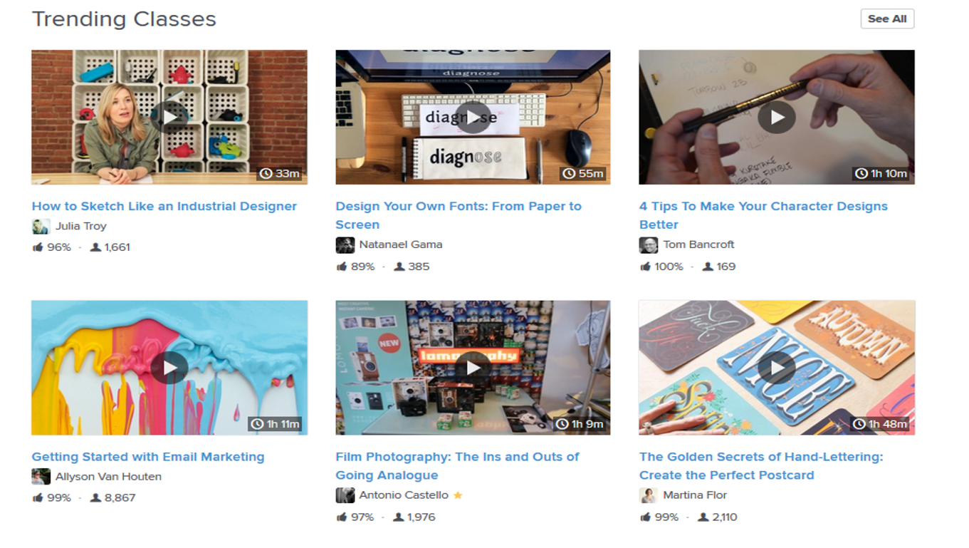 Skillshare -- 是一個線上影片教學平台,邀請各種領域的專家透過線上影片的方式開課。只要有真材實料,人人都可能在這裡當老師。目前較主流的課程集中在這幾個領域:設計、攝影、創業、美術、烹飪。