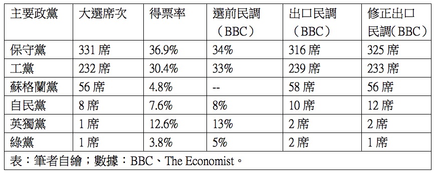 本次英國大選前各民調顯示保守黨與工黨的支持率彼此都在30~35%間僵持,所以英國媒體亦覺得這是場史上最接近的選舉,甚至預測沒有政黨能夠過半組閣,以英媒BBC選前一天的支持率民調直接換算席次率的話是聯合內閣的型態,若從大選之後的得票率來看,較為接近民調,但在單一選區相對多數決制之下,得票率往往無法直接反應到席次率。較令人驚訝的是,蘇格蘭民族黨選前民調沒有突出表現,但卻能有4.8%的得票率,比較可能的原因是選前多數民調以全國性為主,所以以蘇格蘭這種地域性政黨,無法反映到民調之中。另外則是較為準確的民調是當天選舉的出口民調,從BBC兩次發佈的出口民調顯示,還是無法完全準確預測結果。