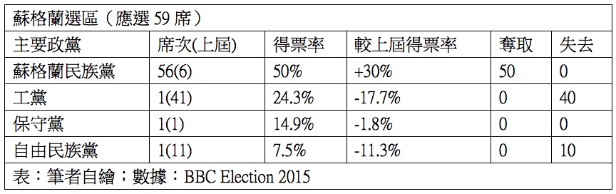 此次蘇格蘭民族黨在蘇格蘭全部共59選區中拿下了56個選區,現任六席未失,再分別從工黨和自由民主黨各奪下40席及10席,當天最引人注目的蘇格蘭民族黨當選人,就是還是在就讀大學的Mhairi Black將工黨影子內閣外相Douglas Alexander拉下馬,締造英國國會350年來最年輕的議員,蘇格蘭一直是工黨的票倉,所以蘇格蘭民族黨的崛起對工黨損失尤其嚴重,去年的蘇格蘭獨立公投,讓工黨必須選邊站,所以當保守黨、工黨、自民黨一起簽署承諾書希望蘇格蘭不要獨立,雖然最後蘇獨公投沒過,也讓蘇格蘭人對工黨支持下降,轉投蘇格蘭民族黨,造成工黨在蘇格蘭的潰敗。