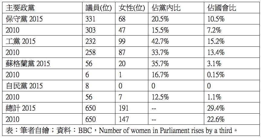 此次大選另一個觀察重點在於女性議員的比例,本次下議院議員650人中有191人是女性,佔下議院議員的比例達29%,自1918年來最高,除了自由民主黨外,保守黨、工黨、蘇格蘭民族黨的黨內女性議員人數與比例均較上屆(2010)增加,台灣在不分區名單對女性的保障,至少要有二分之一,讓女性在國會有一定比例存在。