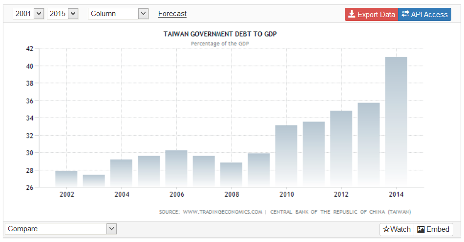 馬英九開口閉口都是他最會拚經濟,結果卻是拚出了政府負債創新高,每個人為馬英九背債144萬元。當年聲稱準備好了、經濟馬上就會好的馬英九,聲稱絕不舉債還可以讓政府每年盈餘2千億至4千億的馬英九,現在卻創下平均每年舉債2524億元、七年合計1兆7671億的驚人數字。根據Trading Economics的資料,台政府債務佔GDP比例已經達到了41%,馬政府還自稱前三年度名目GDP平均數36.16%,尚在公共債務法規定上限40.6%之範圍。