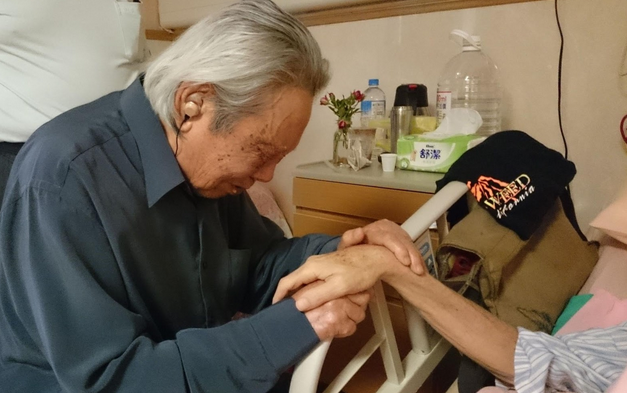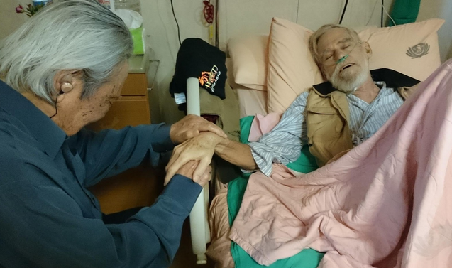 父親一進入病房便哭了,佝僂著幾乎無法站立。一直在此照顧Lynn的盧孝治夫婦幫父親找了一張椅子。父親坐定後問Lynn「會疼嗎?」「哪裡痛?」來回輕撫著Lynn乾瘦的手臂。「我幫你禱告好嗎?」Lynn點點頭。父親便以日語開始禱告。Lynn閉上雙眼,面帶微笑,接受父親的祝禱、期待上帝的指引。