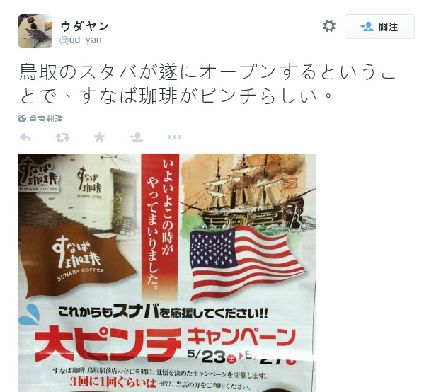 「いよいよこの時がやってまいました……(這個時候,終究還是到來了)」,Sunaba珈琲在宣傳單中一派語重心長,沒有用黑函告訴你對方是不是用血汗咖啡豆,或者跨國企業中間可能剝削了多少勞動成本,而是畫上了黑船,告訴拿到傳單的潛在顧客,這回以賭上店鋪存亡、抱持覺悟之心的活動與對手正面交鋒。促銷活動就選在Starbucks鳥取一號店開幕日展開,他們傳授省錢祕訣有三:前30名顧客咖啡免費、拿Starbucks的發票消費打半價,更絕的是,任何人如果敢大聲說出「比(畫上美國國旗)的咖啡更難喝」的話,綜合咖啡免費。當然,不能指名道姓,所有關鍵字都用美國國旗來取代,黑船要你激起愛用國貨心。結果大成功,23日Starbucks開店當天,Sunaba珈琲營業額多過平常的五倍,大約700人來店消費。