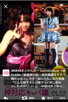 松村香織是AKB48姊妹團「SKE48」的成員,在最近才結束的第七回AKB48總選舉中獲得第13名的好名次。但人紅是非多是長久以來不變的定律,總選舉第二名的柏木由紀,先前才爆出和傑尼斯偶像團體NEWS成員手越祐也的旅行親密照,松村香織也在6月23日被周刊爆料在進入演藝圈之前曾在酒店打工。