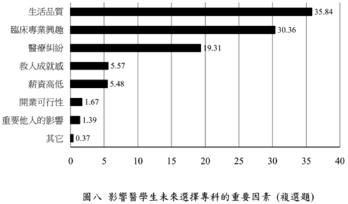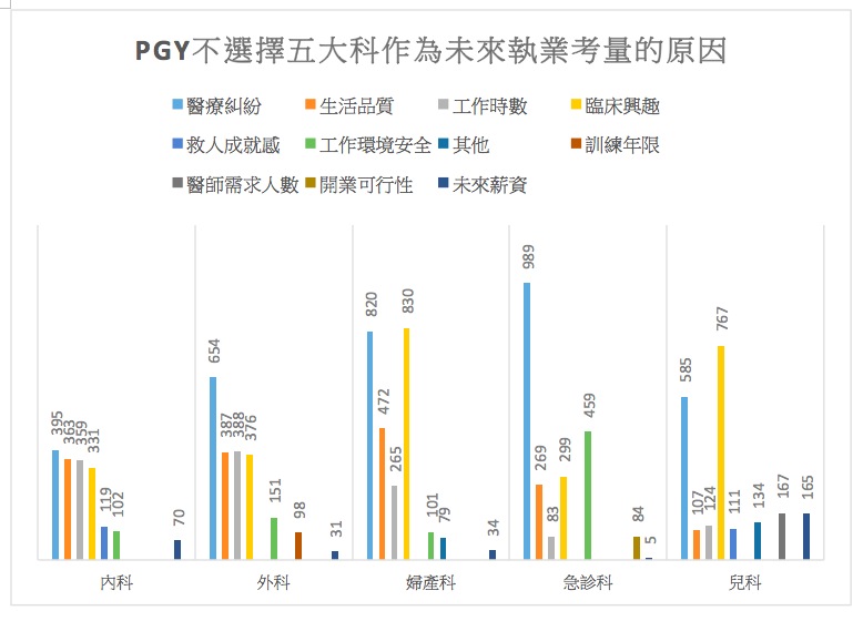 而當分別問及不願意投入五大科的考量因素時,除了兒科以外,醫療糾紛、生活品質、工作時數、臨床興趣、工作環境安全都佔前六重要的考量因素,而未來薪資則較不重要,而兒科的考量因素則依序是臨床興趣、醫療糾紛、需求人數、未來薪資、其他、工作時數、救人成就感、生活品質。