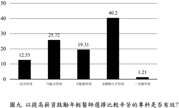 而當問到提高薪資是否可以鼓勵年輕醫師選擇比較辛苦的專科時,有38.25%認為一定沒有效或可能沒有效,另外有40.2%認為金額夠大才有效,而認為可能會有效或一定會有效的只占20.52%。