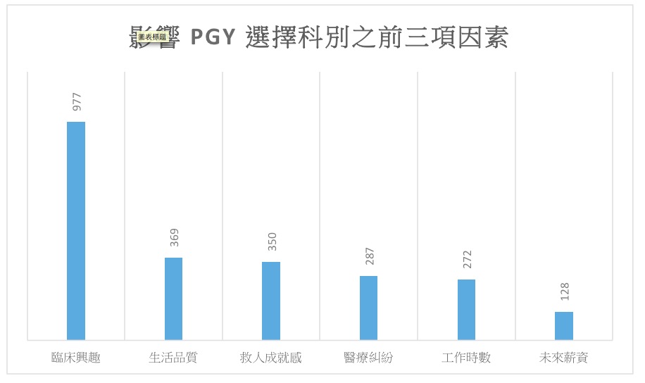 無獨有偶的,國家衛生研究院在102年針對631名PGY醫師的「PGY醫師選科意願」調查問卷結果,也發現PGY醫師選擇專科的重要因素,前五重要的考量因素分別是臨床興趣(977分)、生活品質(369分)、救人成就感(350分)、醫療糾紛(287分)和工作時數(272分),而未來薪資較高(128分)則較不重要。