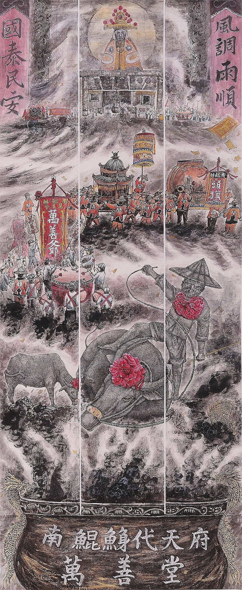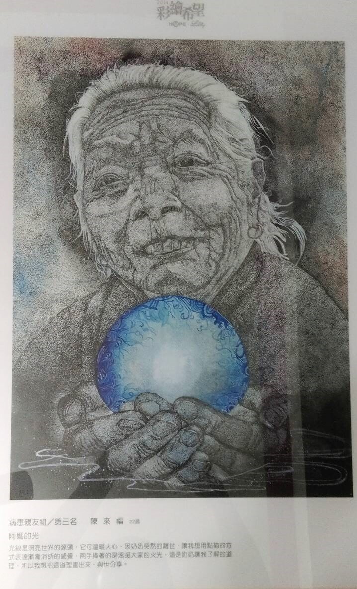 作品以創作者偏愛的點描法,費神地用代針筆所繪製,於阿嬤過世後的服喪期間強忍悲痛完成,故傳遞的感情特別濃烈。利用簡單的黑白兩色呈現阿嬤慈祥的容貌,阿嬤充滿皺紋手上的發光球體,則以藍色漸層來表現,在原本的黑白基調中,視覺效果更顯強烈。創作者想要透過顏色的對比,凸顯阿嬤的那份慈藹、疼愛與期待,或許也是這樣直白強烈的情感,連僅是路過的男子都深受感動。