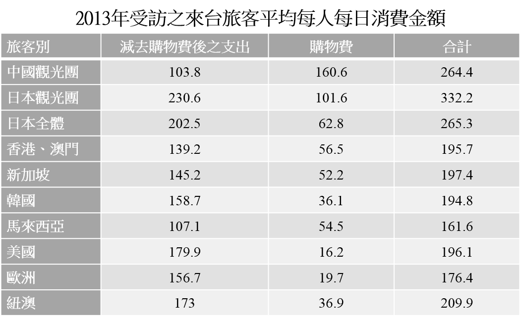 [1] 此調查所得之103美元約略等於中國團客於對岸所繳交之團費,扣除機票錢後的平均每日費用。然而,實務上,這些團費還有相當部分為中方的組團社所抽走。而因本調查來自機場中對旅客的隨機面訪,但一般中國團客並無法知所繳交的費用中,有多少進到自家組團社,又有多少進到台灣的地接社(以支付旅館、交通、食宿、娛樂等費用);面訪中往往又有中方領隊(組團社)在旁,故調查所得之103美元便必然與台灣業界的認知有段差距。根據《新新聞》雜誌於2013年所做的報導(第1369期),台灣地接社能拿到的團費,每人每天最多僅有40美元。即使2013年底有部分的改革措施,仍難以相信2013年中國旅行團給予本地地接社的費用能超過每人每日100美元。