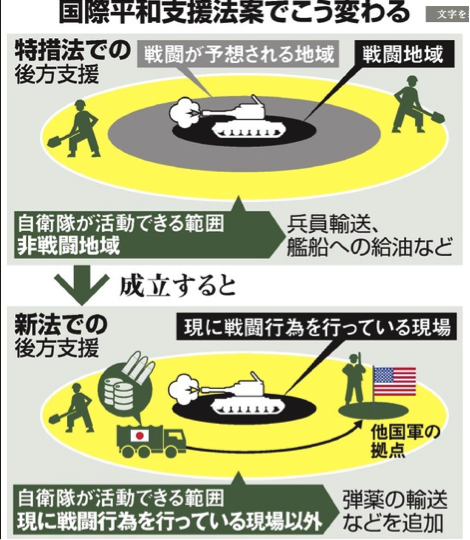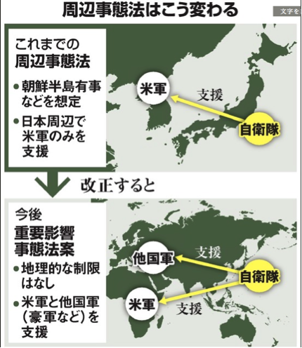 「重要影響事態法案」舊稱「周邊事態法」,原本日本自衛隊只能跟上圖一樣,若在「日本周邊」,例如朝鮮半島、台灣海峽等地發生衝突,自衛隊可以支援美軍。修正以後,不僅取消了地理限制,也取消了只能援助美軍的限制。