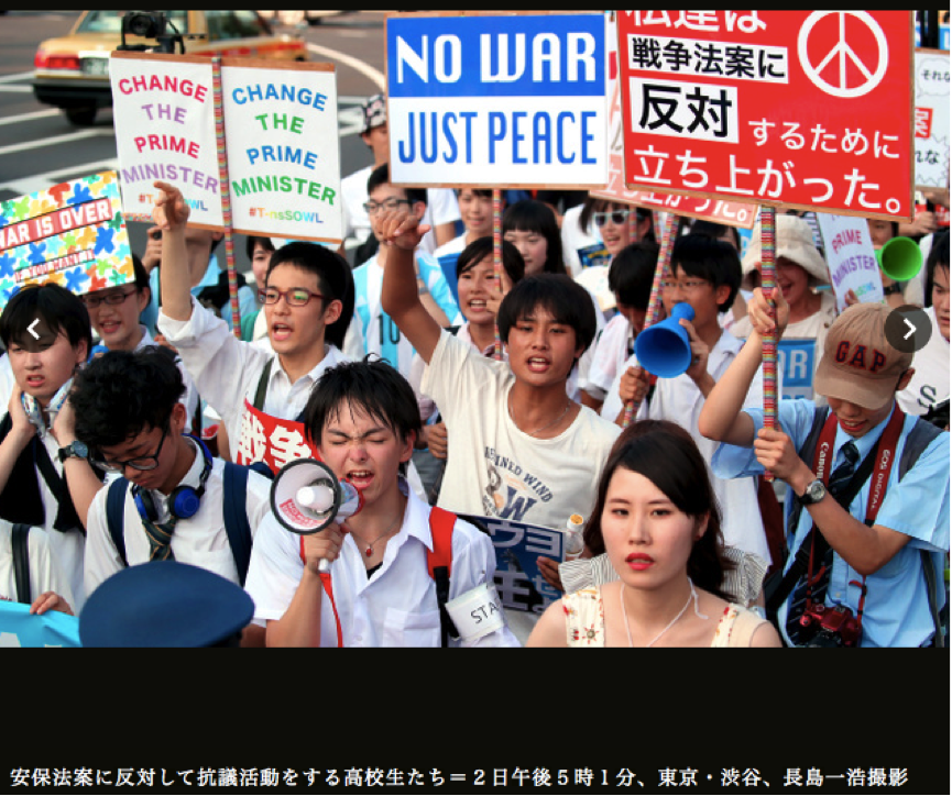 現在,正是戰後日本體制轉換的關鍵時刻;此時原本對政治冷漠的日本社會,無論有無戰爭經驗,連高中生都站出來了;對日本社會而言,對「戰爭」的立場,可以從這次「安保法制」的爭議中展現出來。前面花了大量篇幅說明日本政府巧妙的在不修改九條的狀態下讓日本「正常化」,但從日本近日的抗議浪潮中可以發現,無論老中青,同樣訴諸「反戰」的理念。